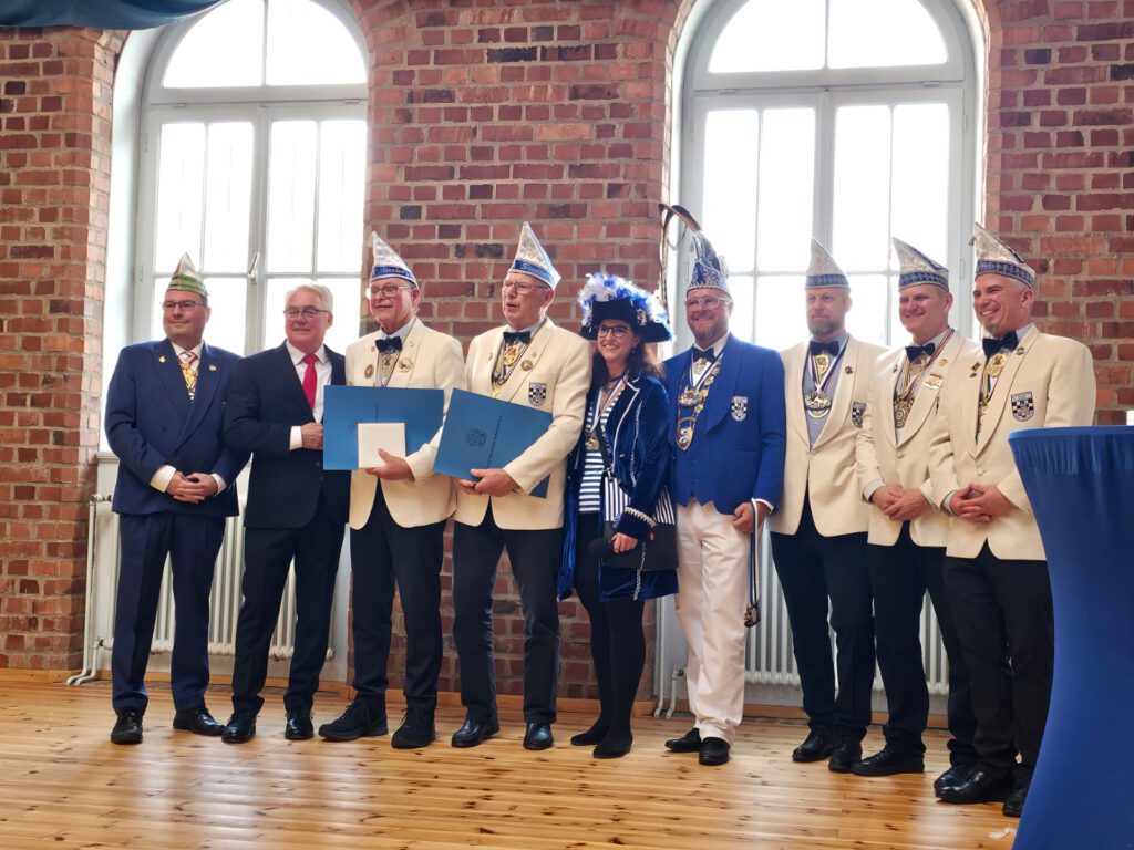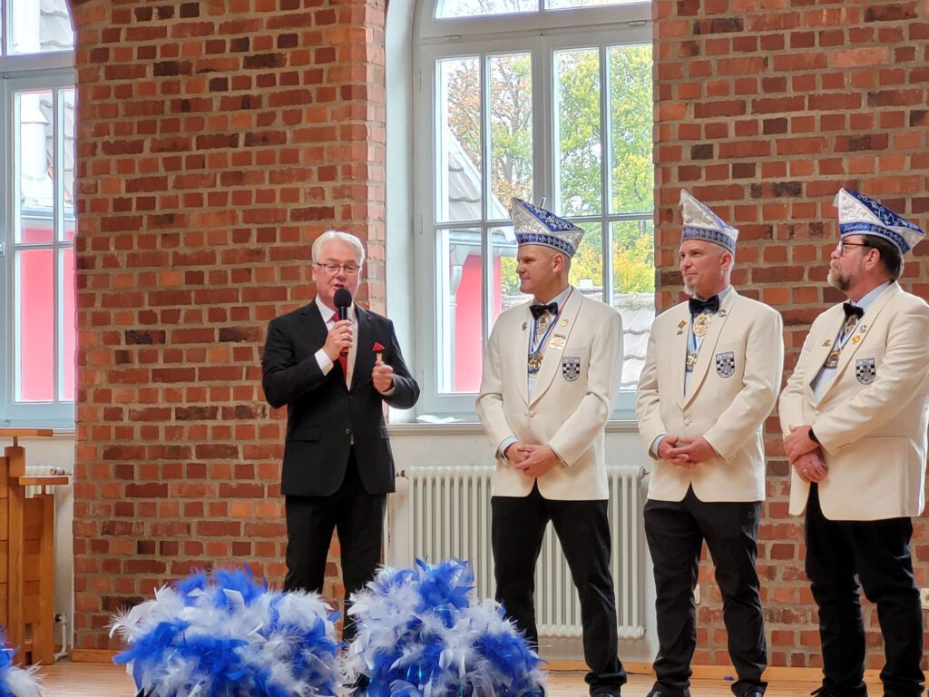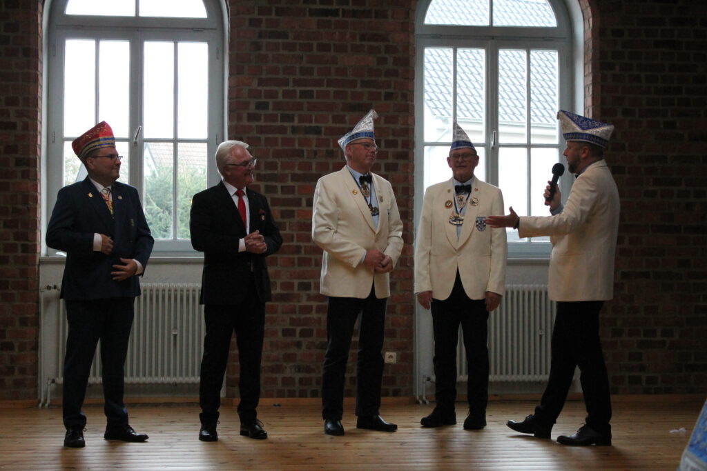 Die Veranstaltung fand in einem stilvoll dekorierten Saal statt, der in den typischen Farben des Karnevals erstrahlte. Bunte Girlanden, funkelnde Lichter und farbenfrohe Karnevalssymbole schufen eine Atmosphäre, die sofort in die närrische Zeit einstimmte. Der Saal war nicht nur optisch ein Genuss, sondern auch ein Ort des Austauschs und der Begegnung für Karnevalisten aus der Region. Es war der ideale Rahmen für den Empfang, welcher kurzweilig und unterhaltsam vom Präsidenten des Regionaverbands Horst Meurer moderiert wurde. Ein Abend der Tradition und Geselligkeit miteinander verband.